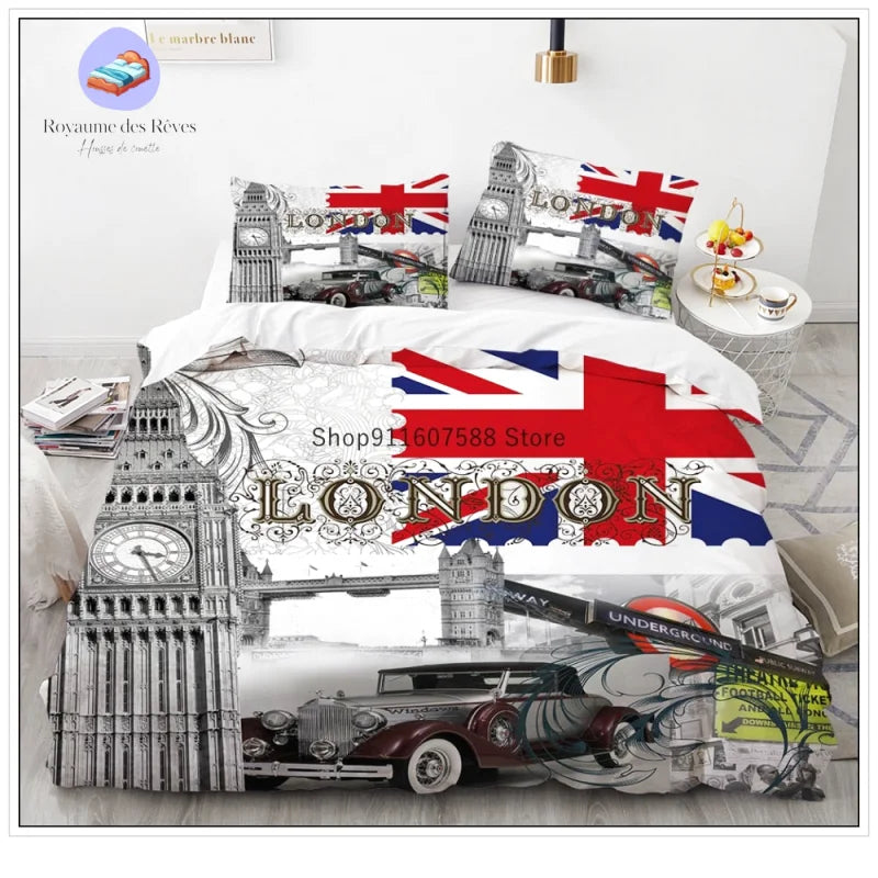 Conçue pour éveiller l’imagination, cette housse de couette met en scène des symboles iconiques tels que Big Ben et le Tower Bridge, créant un décor urbain saisissant. Son design élégant ravira les amateurs de voyages et les passionnés de la culture britannique, s’intégrant parfaitement dans tout style de décoration moderne.