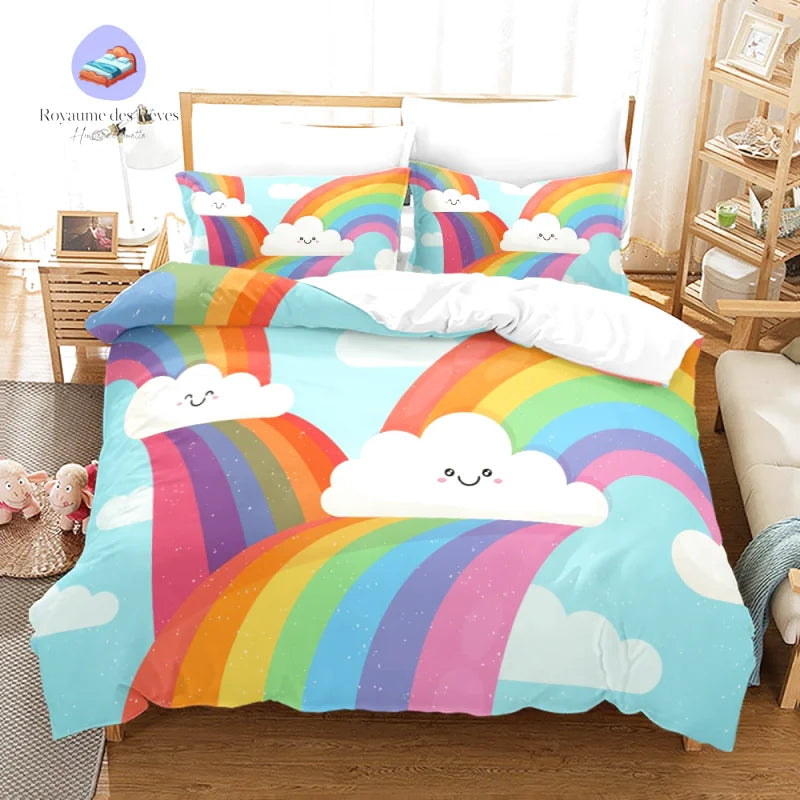 Imprégnée d’une touche délicate de style kawaii, cette création réunit rondes et simplicité. Chaque détail est soigneusement pensé pour offrir une harmonie parfaite dans votre espace de repos. En optant pour l’Arc en Ciel Fierté, vous choisissez une housse de couette qui exprime une véritable joie de vivre.