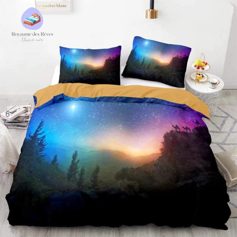 La housse de couette Ciel Étoilé captive les passionnés de paysages et d’illustrations célestes grâce à son impression panoramique. Ce style soigné et artistique transforme chaque chambre en un espace personnel et intime, parfait pour les amateurs de nature et de moments de détente. Chaque pièce est une œuvre d’art qui invite à la réflexion et à la rêverie.