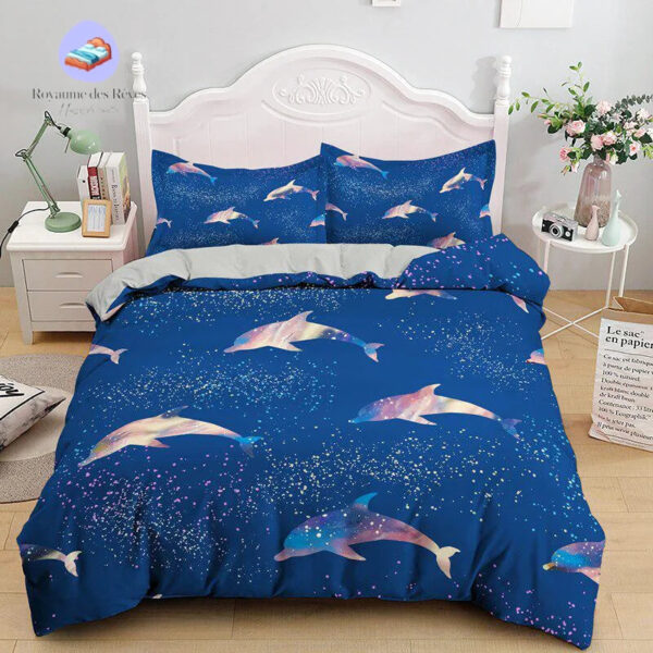 Le Dauphin Océan transforme votre chambre en un véritable sanctuaire marin, enveloppant votre espace de rêve et de tranquillité. Chaque nuit, laissez-vous bercer par les vagues de douceur que procure cette magnifique housse de couette. Elle évoque la beauté et la liberté de l’océan, invitant à l’évasion et au bien-être.