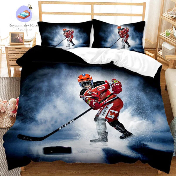 Le Hockey Rondelle se distingue par son esthétique audacieuse, où le joueur en action semble sortir du tissu pour lancer la rondelle à pleine vitesse. Cette housse est parfaite pour ceux qui souhaitent vivre leur amour du sport même pendant leur sommeil, créant une atmosphère immersive et interactive.