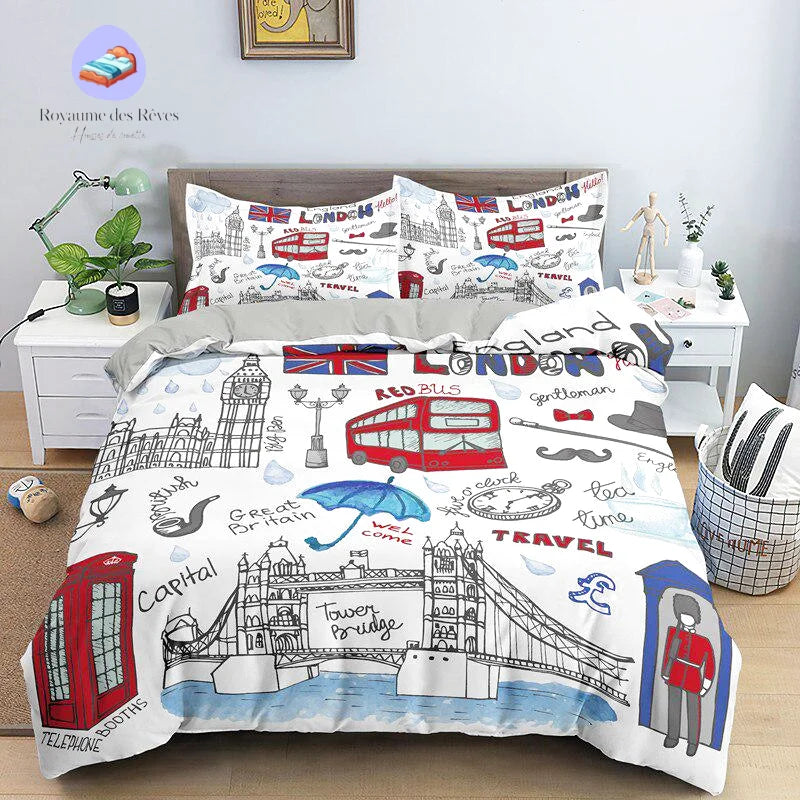 Découvrez la housse de couette Londres Love, une véritable immersion au cœur de Londres qui apportera une touche de sophistication et de charme à votre chambre. Capturant l’essence même de la capitale anglaise, elle combine des éléments iconiques pour offrir un design unique et accrocheur qui séduira les voyageurs urbains.