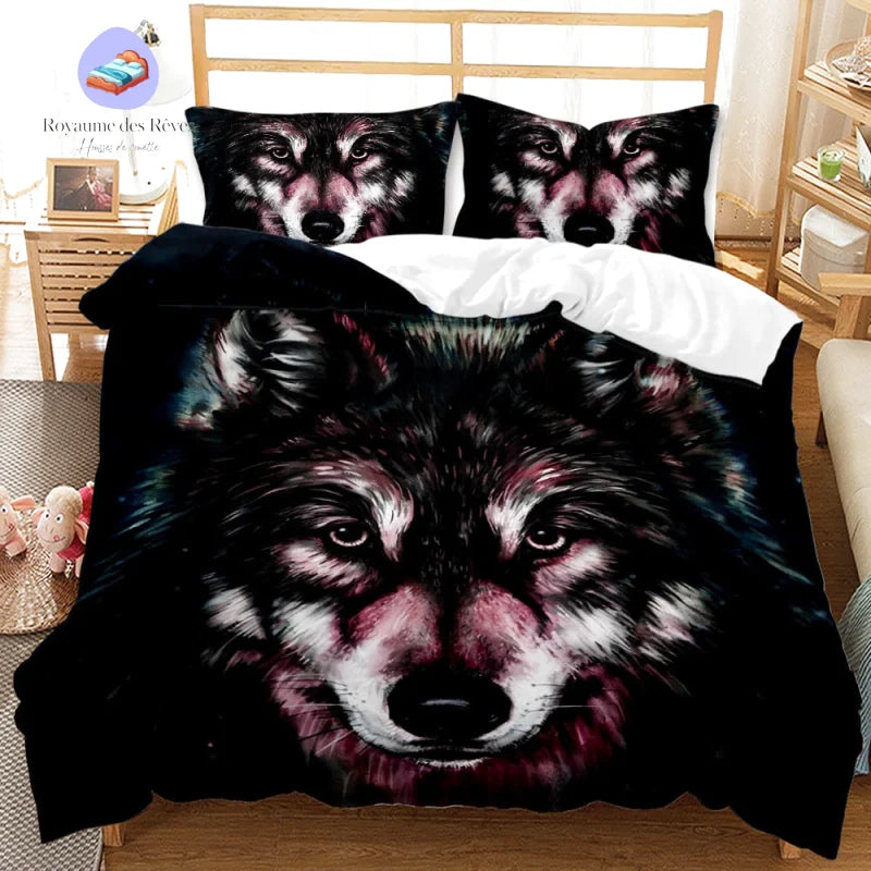 Dans une chambre moderne, la housse de couette Loup 2 Personnes devient un élément central de votre déco. La profondeur du fond noir alliée aux nuances subtiles enrichit l’ambiance tout en résonant avec vos goûts pour les atmosphères intenses et mystiques.