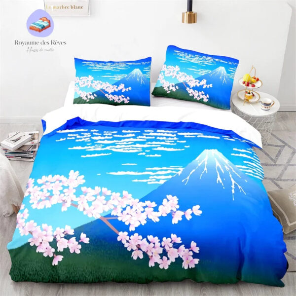 S’inspirant de l’esthétique japonaise, Montagne Fleur Rose marie tradition et modernité sur votre lit. Les fleurs délicates et les montagnes bleutées créent une symphonie visuelle qui embrasse l’art et la nature. Cette housse de couette devient ainsi une pièce centrale dans votre décoration intérieure, où se mêlent poésie et calme.