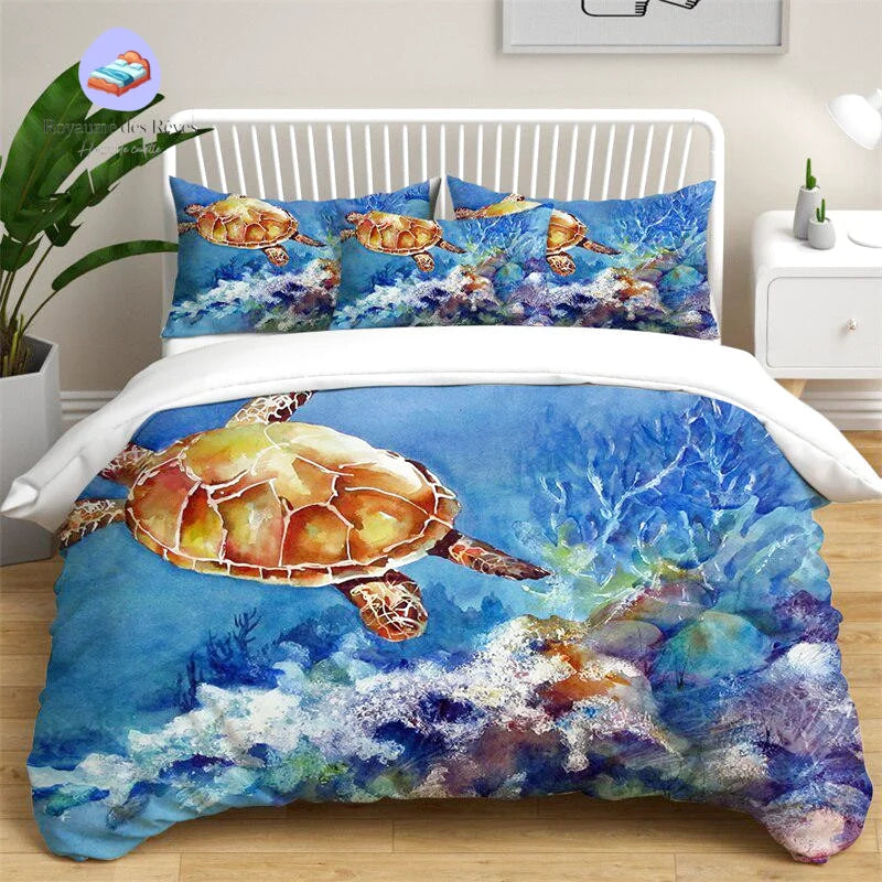 Le design de la housse Océan Turquoise met en scène une majestueuse tortue marine nageant avec grâce. Les nuances d’ambre contrastent magnifiquement avec les coraux colorés, créant un tableau vivant qui illumine votre chambre. La composition aquarelle est non seulement artistique mais aussi évocatrice de rêves marins et d’aventures exotiques.