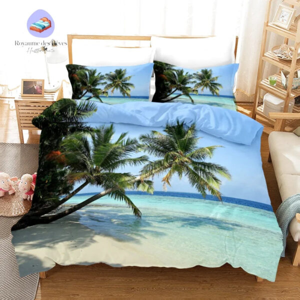 Transformez votre espace nuit avec la housse de couette Palmier Océan. Inspirée par des paysages paradisiaques, cette parure invite à un voyage sensoriel qui vous transporte vers des plages de sable fin, sous des palmiers majestueux. Chaque détail est conçu pour vous offrir une expérience visuelle captivante et apaisante au quotidien.