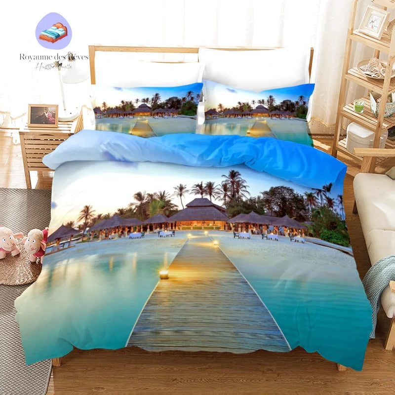 La Palmier Quai est bien plus qu’une simple housse de couette; elle est une invitation au voyage et à la sérénité. Avec son design évoquant des paysages tropicaux, elle transforme n’importe quel espace en une véritable escapade paradisiaque. Imaginez-vous bercé par la brise des palmiers au bord d’une lagune paisible. Cette housse de couette est conçue pour ceux qui cherchent à apporter une touche de rêve exotique dans leur chambre.