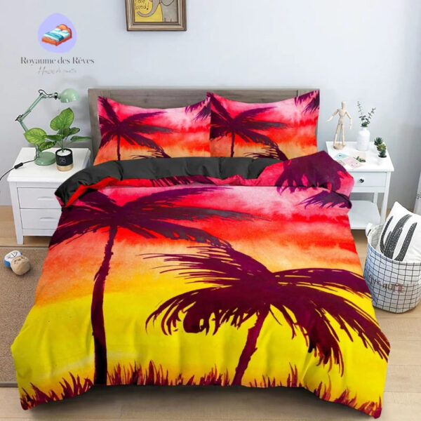 Quel que soit votre âge, la housse de couette Palmier Soirée est idéale pour les adolescents, jeunes adultes et couples à la recherche d’une ambiance exotique dans leur chambre. Ce design séduit les amateurs de voyages et de paysages tropicaux, apportant une sensation de liberté et d’évasion directement dans votre maison.