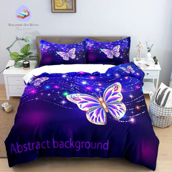 Plongez dans un monde magique avec la housse de couette Papillon Festive. Inspirée par la beauté des papillons en pleine danse nocturne, elle apporte une touche de rêve et de magie à votre chambre. Ce design transforme chaque nuit en une expérience poétique, combinant liberté et émerveillement.