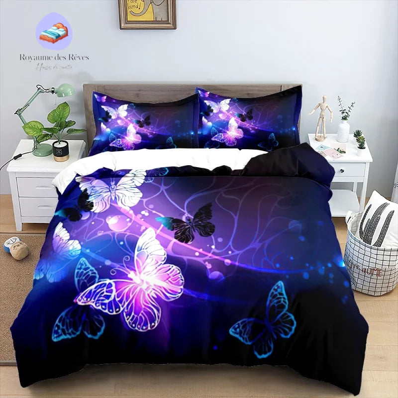 Les effets néon subtils qui entourent les papillons de la housse Papillon Réaliste ajoutent une dimension lumineuse et moderne à l’ensemble. Ce contraste entre les tons sombres et les éclats lumineux offre à votre pièce une esthétique innovante et prête à émerveiller vos invités ou à vous réconforter après une longue journée.