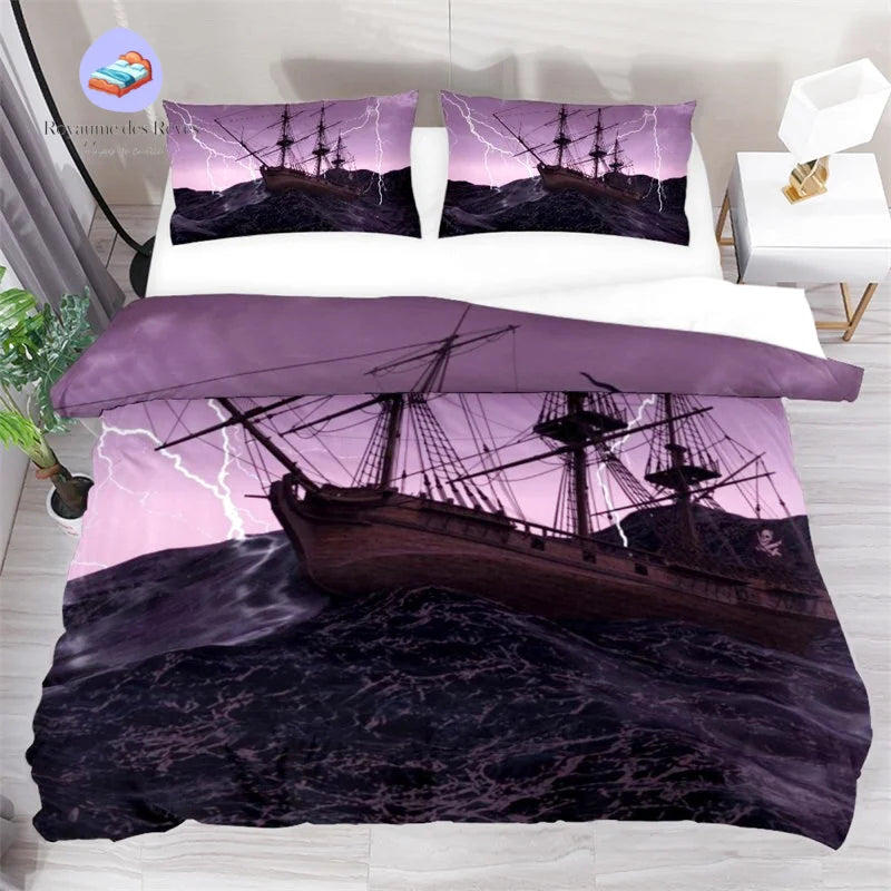 Cette housse de couette incarne l’essence même de l’aventure en haute mer. Avec son design immersif, elle suscite des sensations de danger et d’excitation, capturant l’esprit indomptable des navires pirates naviguant sous un ciel orageux, défiant les vagues dans une ambiance sombre et dramatique.