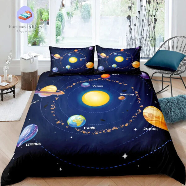 Intégrer la housse Planète Terre dans votre décoration intérieure signifie non seulement embellir votre chambre, mais aussi stimuler votre esprit. Ses illustrations précises et ses teintes de bleu nuit et multicolores conspirent pour créer un environnement inspirant où l’apprentissage rencontre le style.