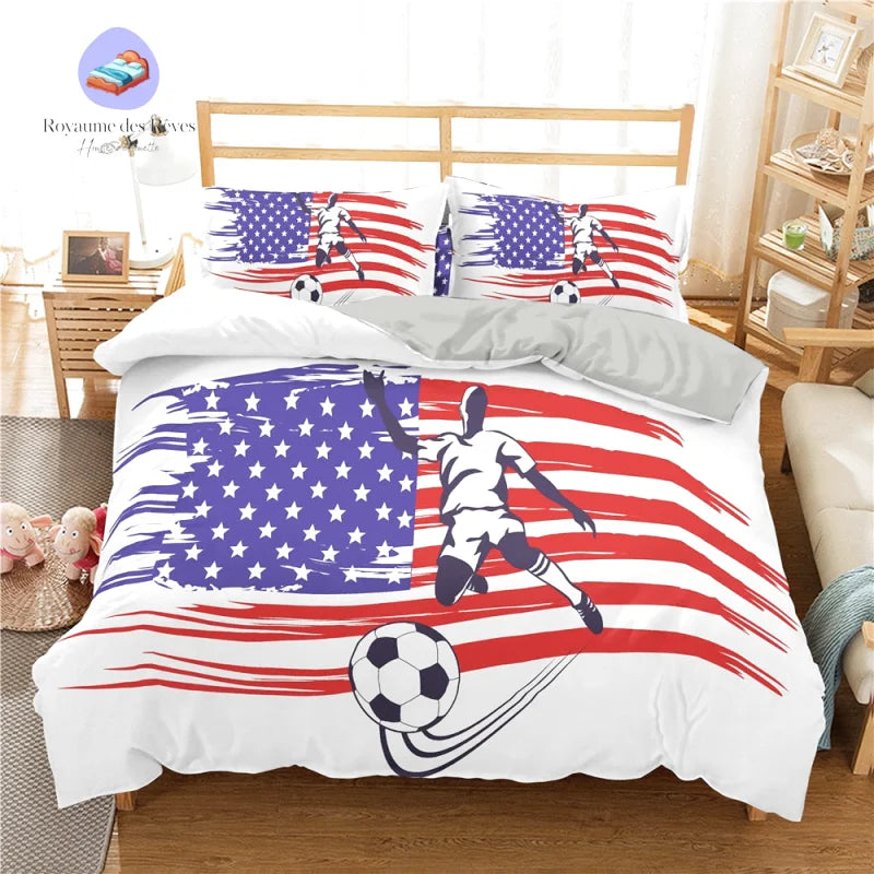 Fabriquée en polyester de haute qualité, la housse de couette Soccer Américain garantit confort et durabilité. Le toucher doux et léger du tissu apporte une sensation de chaleur agréable, idéale pour une utilisation quotidienne. Ce produit allie esthétique et fonctionnalité, répondant aux besoins des amateurs de sports qui privilégient un linge de lit pratique et élégant.