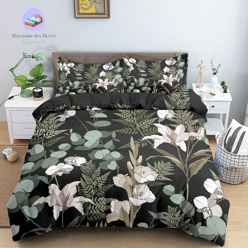 L’alliance de grandes feuilles et de délicates fougères sur un fond anthracite donne à la housse de couette Tropical Neutre un style à la fois chic et relaxant. Les couleurs naturelles et apaisantes de cette housse apportent une ambiance paisible à votre chambre, parfaite pour se ressourcer après une longue journée.